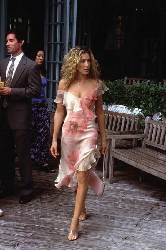 Самый романтичный лук - летящее цветочное платье. Оно невероятно красиво смотрится на точеной фигуре Кэрри Брэдшоу. Художники по костюмам также очень правильно подобрали обувь, которая не выступает акцентом в образе, продолжая тему утонченности. Минимум макияжа, невесомое украшение и небрежная укладка вдобавок – залог успеха этого выхода.