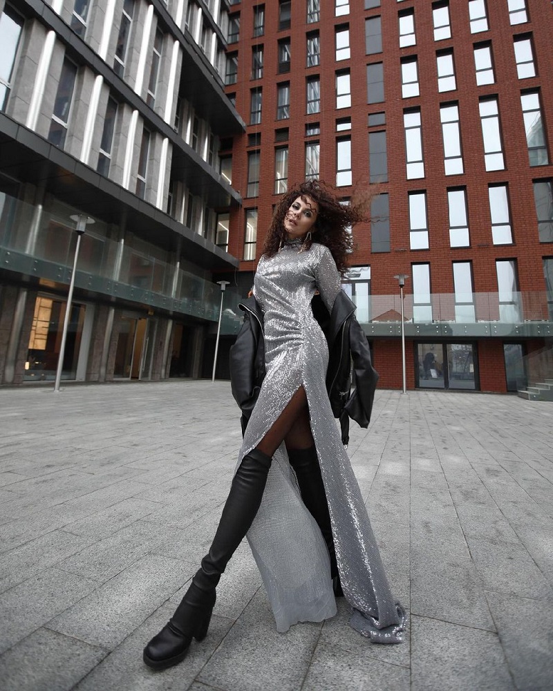 Если же вы наоборот хотите сиять в новогоднюю ночь, советуем обратить внимание на серебристое платье макси с разрезом от бедра, как у известной певицы Насти Каменских. Свой образ она дополнила ботфортами на массивной подошве.
