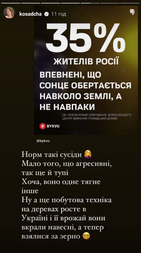 "Норм такие соседи. Мало того, что агрессивные, так еще и тупые. Хотя одно тянет за собой другое. Ну а еще бытовая техника на деревьях растет в Украине, и ее урожай они украли весной, а теперь взялись за зерно", - высмеяла россиян знаменитость.