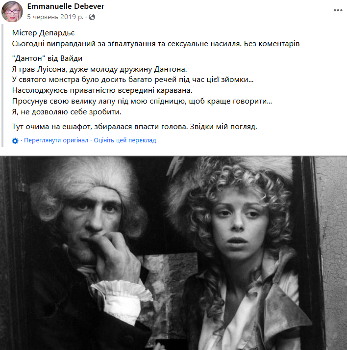 Эммануэль Дебевер обвинила своего коллегу Жерара Депардье в сексуальных домогательствах еще в 2019 году, написав пост в Facebook. Она утверждала, что это произошло в 1982 году во время съемок "Дантона", где они вместе снимались.