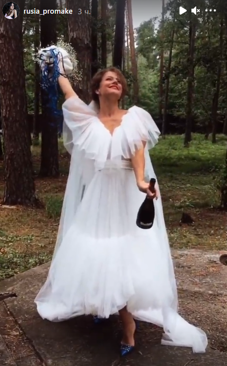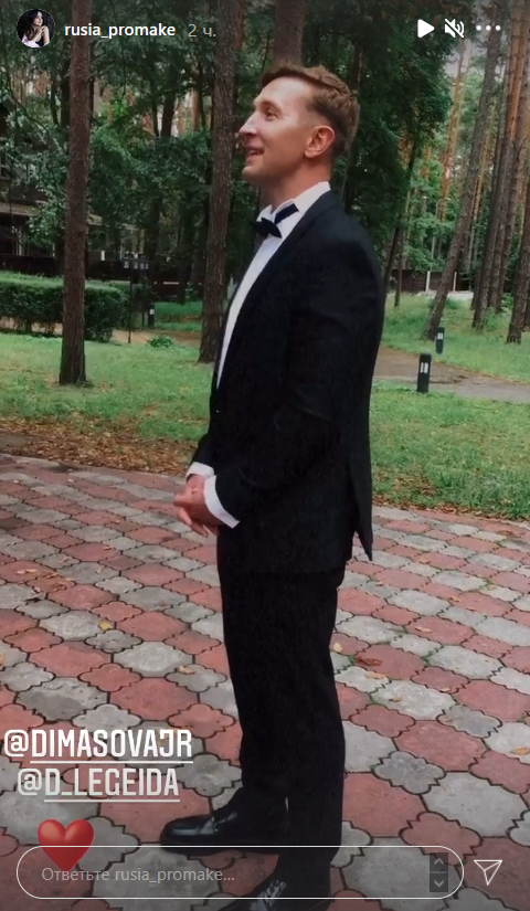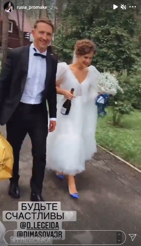 Легейда выбрала для торжества белое платье из фатина, которое сочетала с синими туфлями, а Сова нарядился в классический черный смокинг.