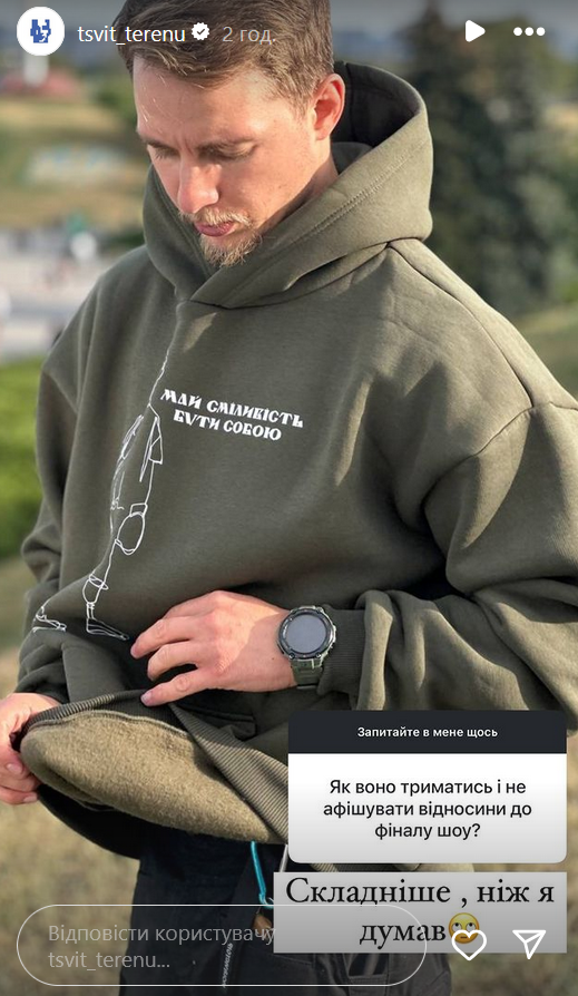 "Как оно держаться и не афишировать отношения до финала шоу?", - спросила Александра подписчица. На что он ответил: "Сложнее, чем я думал".