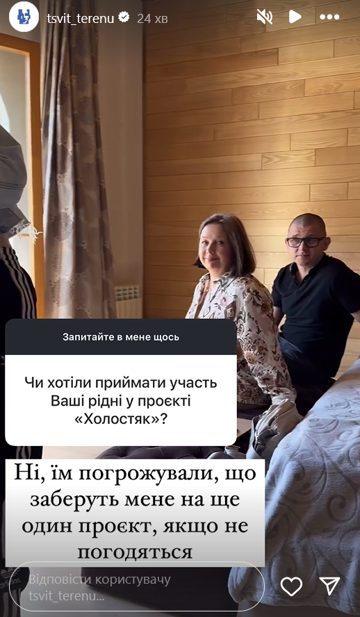 На следующие вопросы о его участии в романтическом шоу Терен стал отшучиваться. Отвечая поклоннице, хотели ли его родные сниматься в "Холостяке", Александр ответил с юмором.