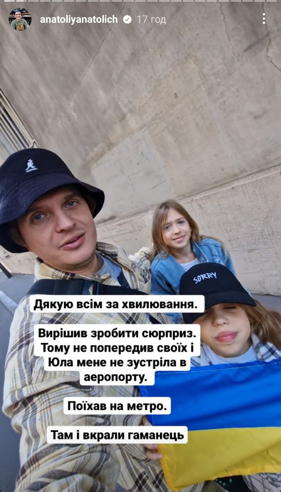 Анатолий Анатолич приехал в Париж, чтобы в свой день рождения 26 сентября навестить жену Юлу и троих детей - 11-летнюю Алису, 9-летнюю Лолу и годовалого сына Нила. В столице Франции украинского ведущего ограбили, о чем он рассказал в Instagram.