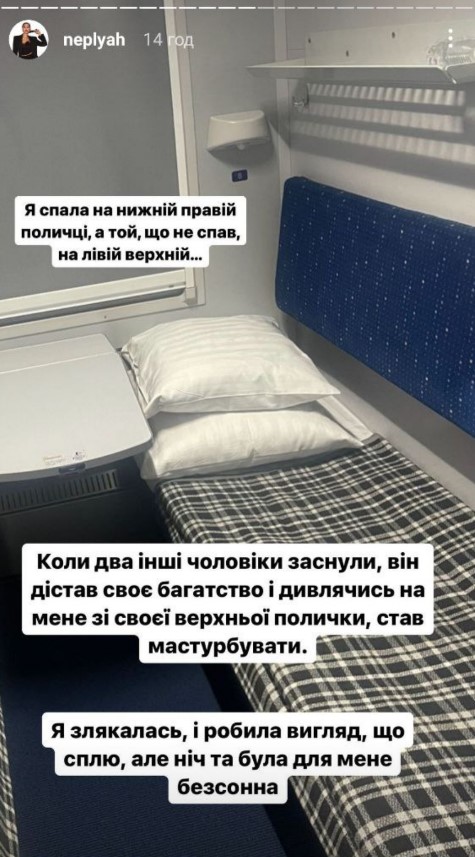 "Я спала на нижней правой полочке, а тот, что не спал, - на левой верхней. Когда двое других мужчин заснули, он достал свое богатство и, глядя на меня со своей верхней полочки, стал мастурбировать. Я испугалась и делала вид, что сплю. Но ночь была для меня бессонной. Мое личное спасибо "Укрзалізниці", что услышали женщин и реализуете вагоны, где каждая женщина сможет почувствовать себя безопасно", - добавила она.