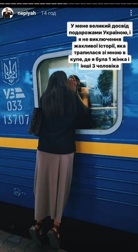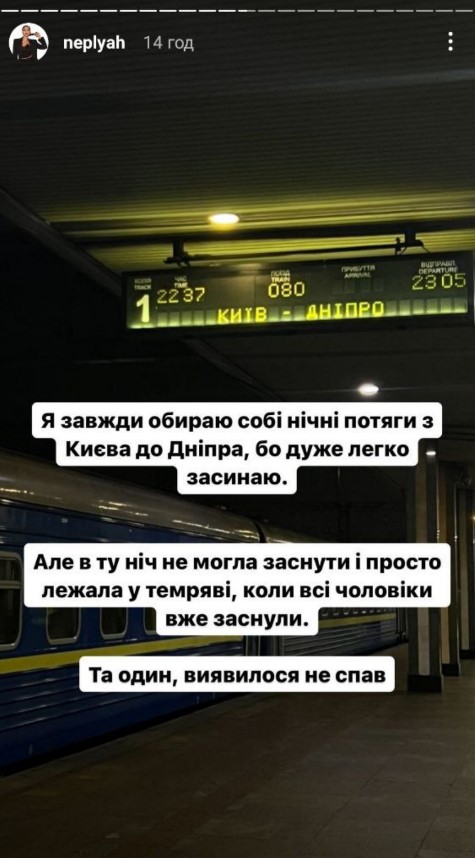 "У меня большой опыт путешествий по Украине, и я не исключение ужасной истории, которая случилась со мной в купе, где я была одна женщина и другие трое мужчин. Я всегда выбираю себе ночные поезда из Киева в Днепр, потому что очень легко засыпаю. Но в ту ночь я не могла заснуть и просто лежала в темноте, когда все мужчины уже заснули. Но один, оказалось, не спал", - отметила Неплях.