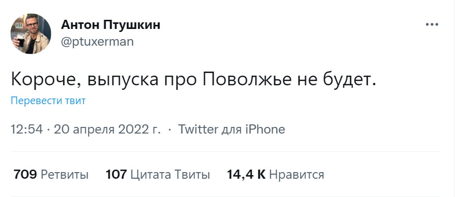 Птушкин решил не медлить с ответом и прокомментировал сложившуюся ситуацию. "Короче, выпуска про Поволжье не будет", - с иронией заявил он на своей странице в Twitter.