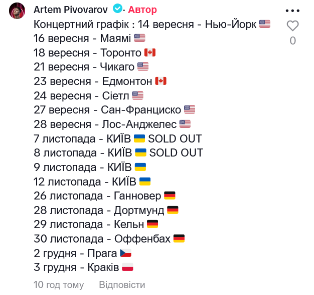 Артем Пивоваров отправился в заграничный тур по городам Америки и Канады в начале сентября. Перед выступлением на Таймс-сквер певец 14 сентября провел концерт в Нью-Йорке в Brooklyn Steel. 16 сентября украинский артист спел в Майами. Впереди выступления в Торонто, Чикаго, Эдмонтоне, Сиэтле, Сан-Франциско и Лос-Анджелесе.