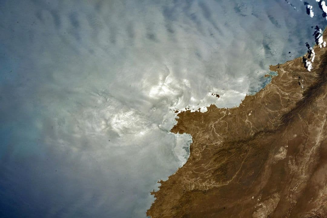 Так, бортинженер МКС Томас Маршберн показал, как солнце отражается в океанских волнах у восточного побережья Аргентины.