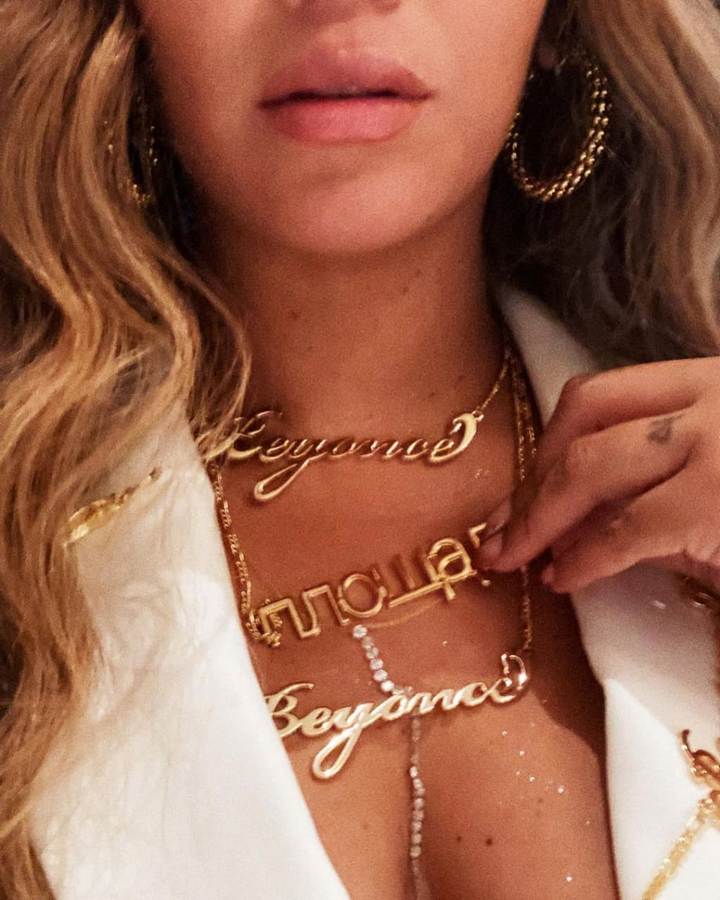 На серии фотографий Бейонсе позирует в белом костюме с множеством золотых цепей и украшений. Среди них встречаются подвески с именем певицы, иероглифами, а также со словом "Площадь", к которому нашлось немало вопросов.