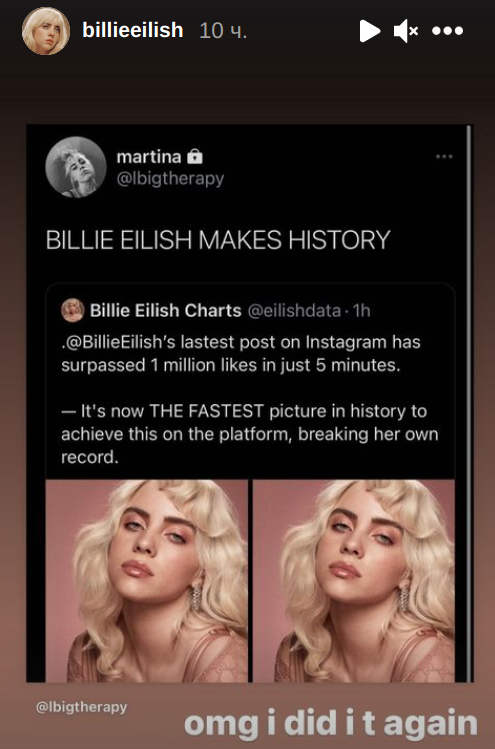 "О мой бог, я сделала это снова", - со смехом прокомментировала Билли свое достижение в Instagram-историях.