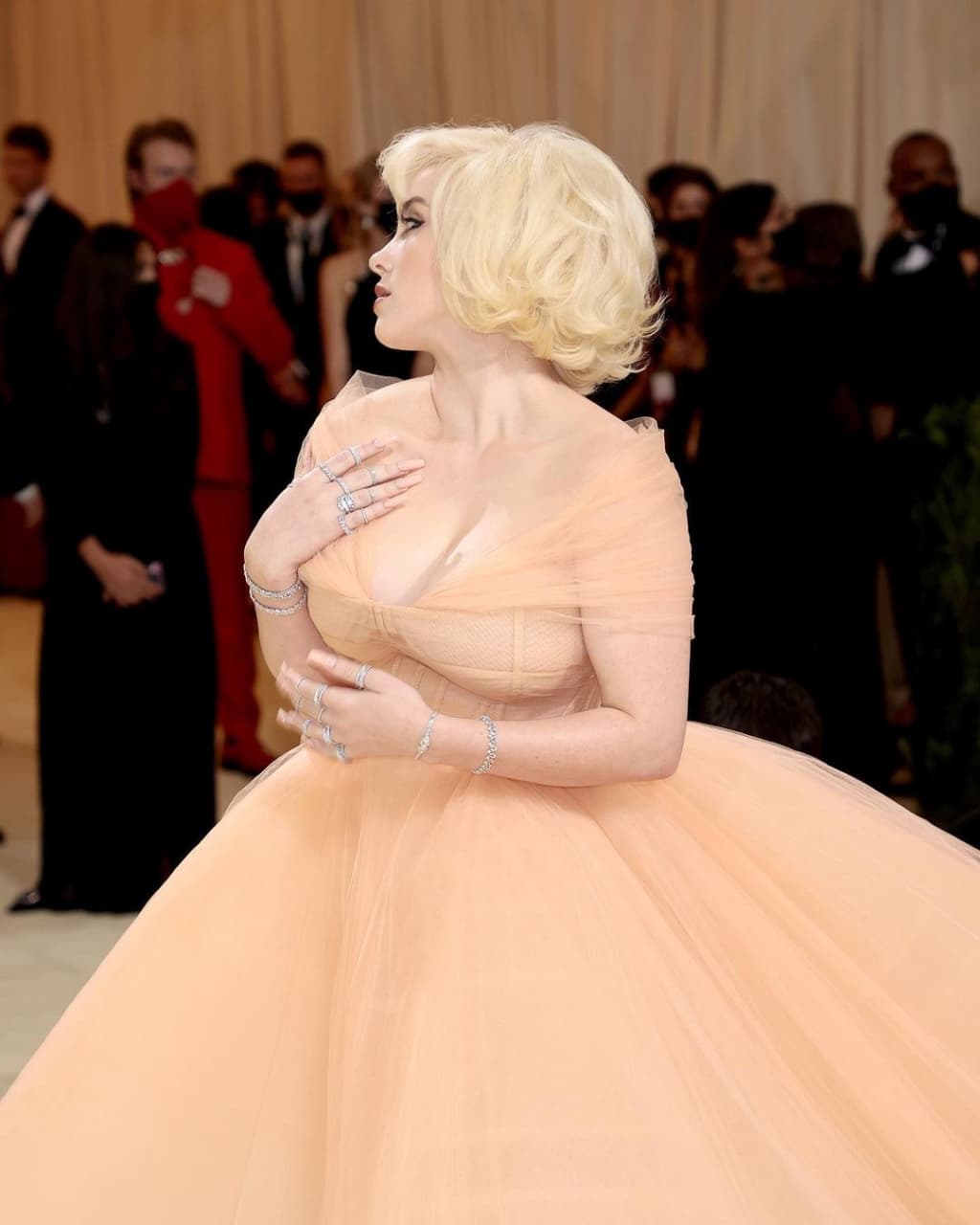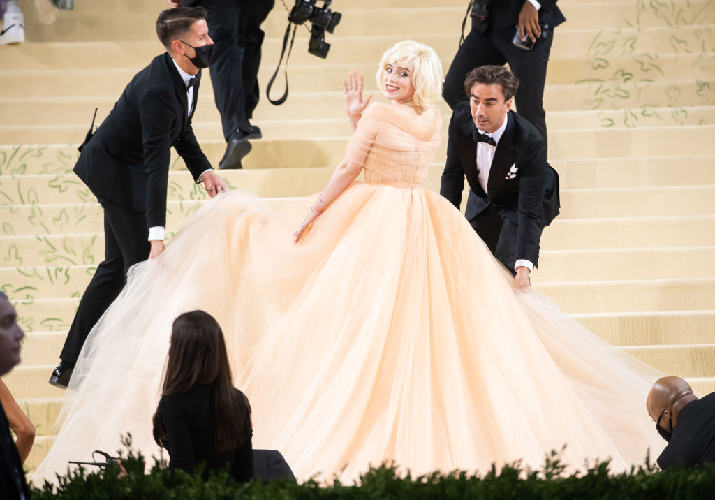 Персиковое платье с корсетным лифом, открытыми плечами, пышной юбкой и длинным шлейфом из тюля Билли дополнила 30 украшениями Cartier. Певица согласилась надеть на мероприятие роскошный наряд американского модного дома в обмен на "небольшую" услугу: команда Oscar de la Renta обязалась прекратить использовать натуральный мех.