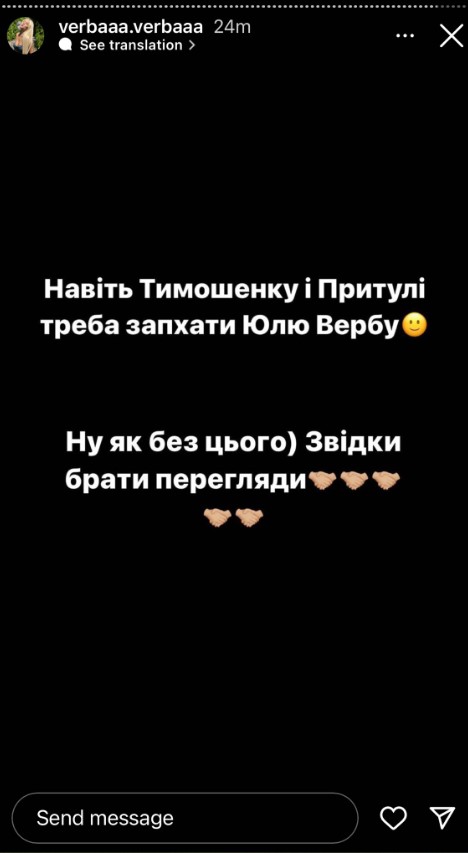 Впоследствии Верба заявила, что упоминанием ее имени в подкасте Тимошенко и Притула пытаются набрать большее количество просмотров: "Даже Тимошенко и Притуле нужно запихать Юлю Вербу. Ну как без этого, откуда брать просмотры?".