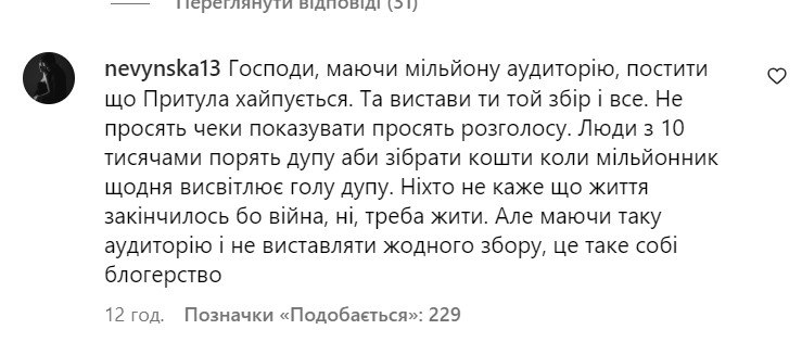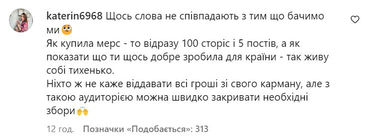 "Знаете, почему меня никак не затрагивает хейт, что я не помогаю армии? Потому что я доначу просто сотни тысячи гривен. Но тихо. Потому что делаю это не для сохраненных сторис или чтобы для кого-то быть хорошей. Я делаю это тихо, с чистой совестью для себя и для своей страны. А вы можете только п*здеть, потому что думаете, что знаете все. Но представляете, есть люди, которые донанят, и не кричат об этом в каждом сторис", - говорится в посте.