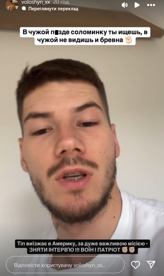 "Саша Волошин, тот самый, который, напомню, свалил из Украины, записывает песню как он скучает по неньке Украине. Сбежал то ли через "белый билет", то ли через "Шлях". Выдал такое расследование, как я в 2023 году был в США", - рассказал он своим подписчикам.