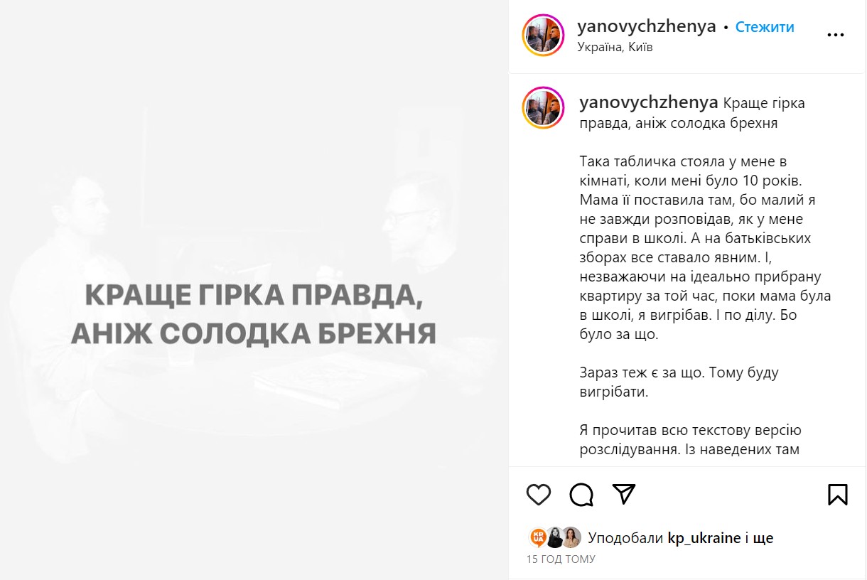 На фоне сложившейся ситуации появилось заявление о том, что "Подкаст терапия" прекращает свое существование. Шоу, которое стало известным на YouTube, Суббота вел вместе со своим другом, комиком и актером Евгением Яновичем. Последний решил прокомментировать скандал и обнародовал пост в Instagram.