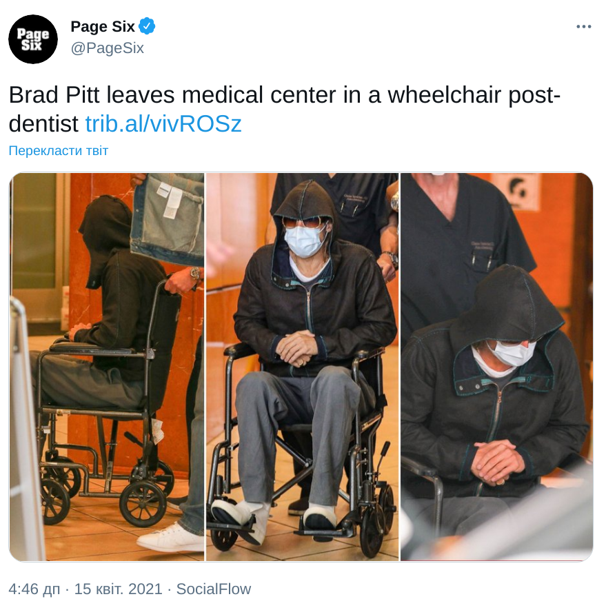 Таблоид заверил, что причин для беспокойства нет: Брэд Питт посетил клинику для стоматологической процедуры и сел в коляску из-за давней политики американских больниц. Таким образом те пытаются избежать ответственности, если пациент травмируется, покидая лечебное учреждение.