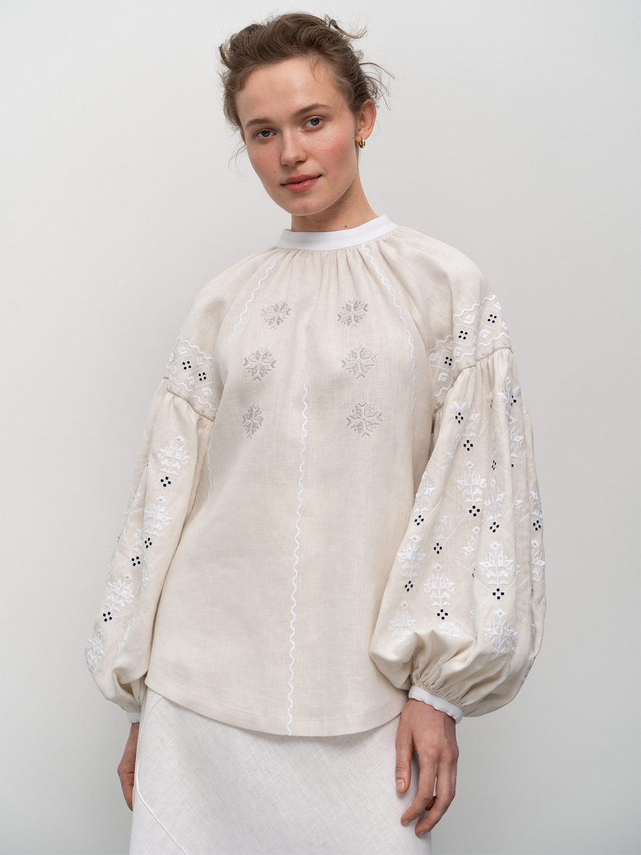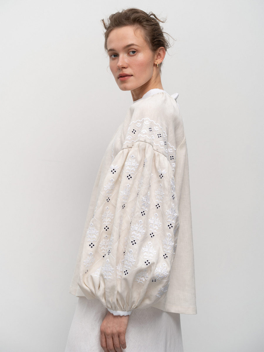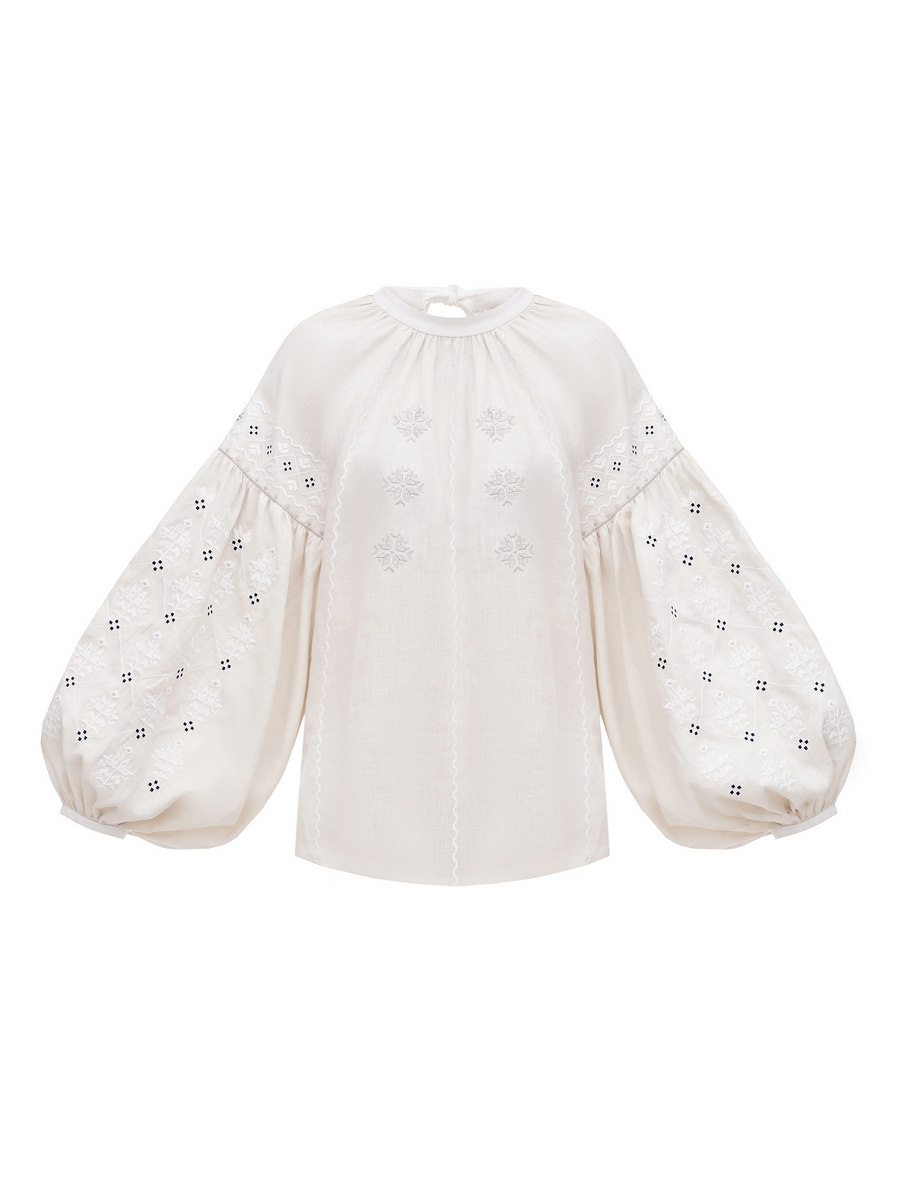 Вышиванка Елены Зеленской называется Poltavska. Изделие имеет объемные рукава, собранные на резинку. Мастера бренда сплошь зашили их орнаментами, но благодаря ажурным техникам, вырезанию и мережке, они не выглядят перегруженными.