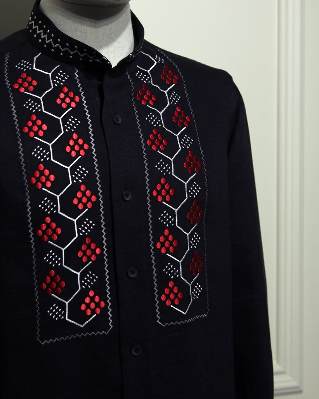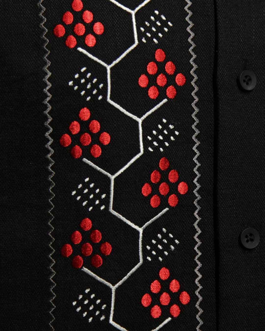 Как рассказали на странице бренда, вышиванка украшена геометрическим орнаментом из красных ягод, стилизованных в форме ветки калины, и белым контуром, форма которого напоминает структуру пчелиных сот.