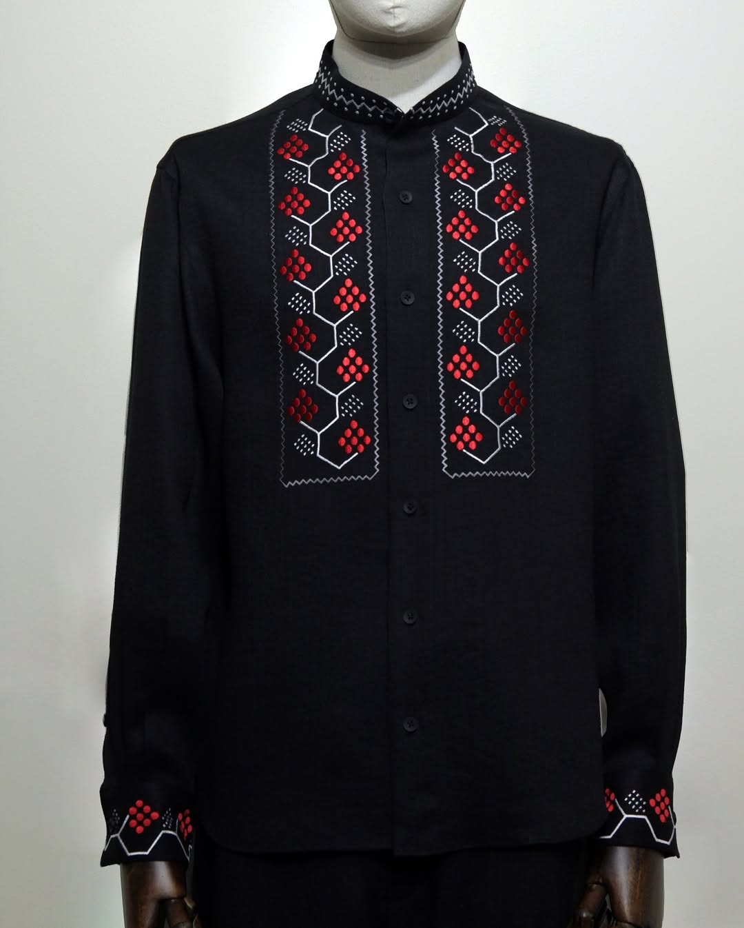 Вышитая рубашка президента Украины выполнена из черного льна и украшена красной и белой вышивкой. Ее название - "Сила, которая держит мир". Вышиванку для Владимира Зеленского создал украинский бренд мужской одежды Damirli дизайнера Эльвиры Гасановой.
