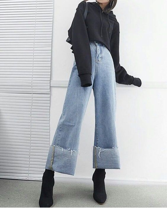 Для любительниц нестандартных решений – джинсы клеш с подворотами. Такой вариант можно сочетать с теплым худи и обувью на невысоком каблуке.