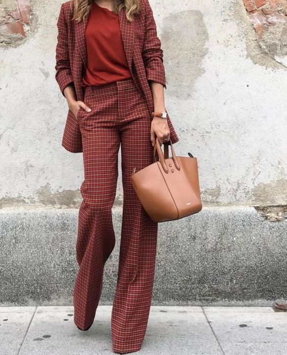 Чтобы создать деловой образ, рекомендуем обратить внимание на костюм с брюками клеш в клетку. Такой лук можно дополнить однотонной водолазкой и стильной сумкой.
