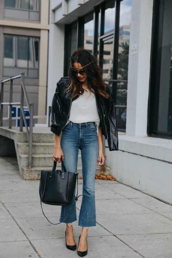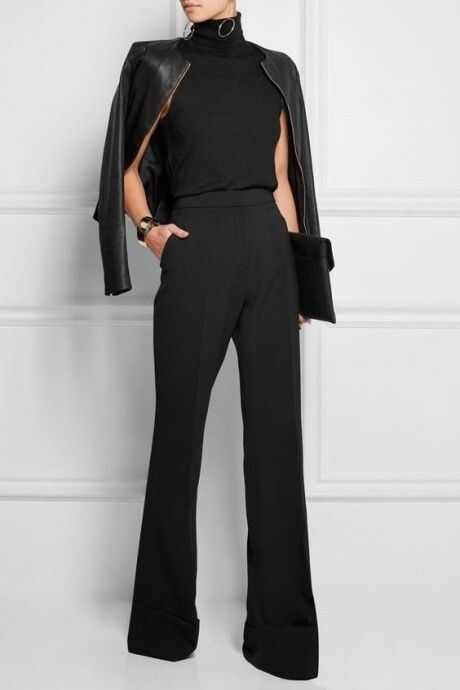 С черными расклешенными брюками можно создать элегантный образ – просто дополните их водолазкой без рукавов, кожаной курткой и клатчем.
