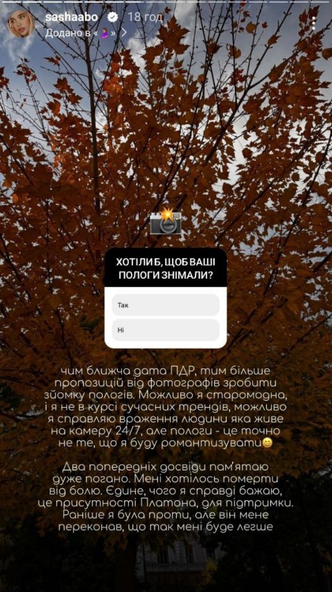 "Чем ближе дата ПДР, тем больше предложений от фотографов сделать съемку родов. Возможно, я старомодна и не в курсе современных трендов. Возможно, я произвожу впечатление человека, живущего на камеру 24/7, но роды – точно не то, что я буду романтизировать. Два предыдущих опыта помню очень плохо. Мне хотелось умереть от боли. Единственное, чего я действительно желаю – это присутствие Платона для поддержки", - отметила украинка.