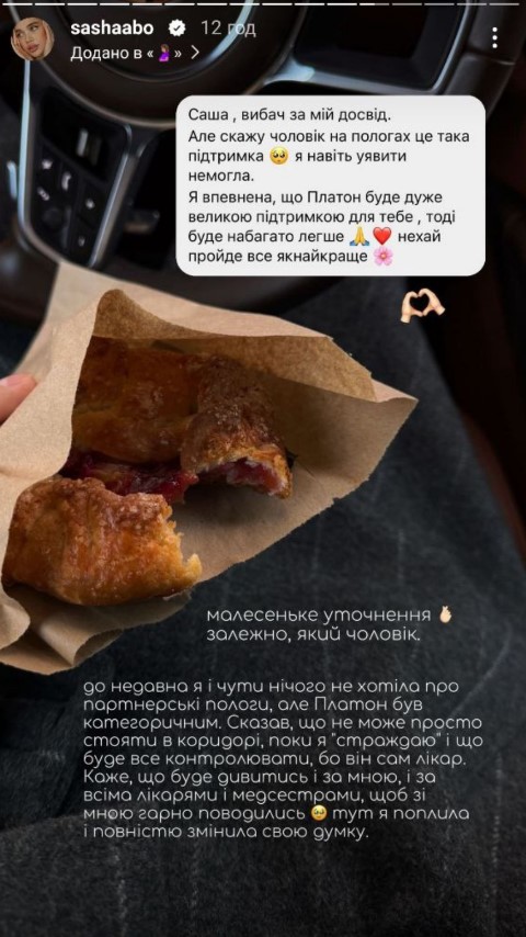 "До недавнего времени я и слышать ничего не хотела о партнерских родах, но Платон был категоричен. Сказал, что не может просто стоять в коридоре, пока я "страдаю". И что будет все контролировать, потому что он и сам врач. Говорит, что будет смотреть за мной, за всеми врачами и медсестрами, чтобы со мной хорошо обращались. Здесь я поплыла и полностью изменила свое мнение", - написала Саша.