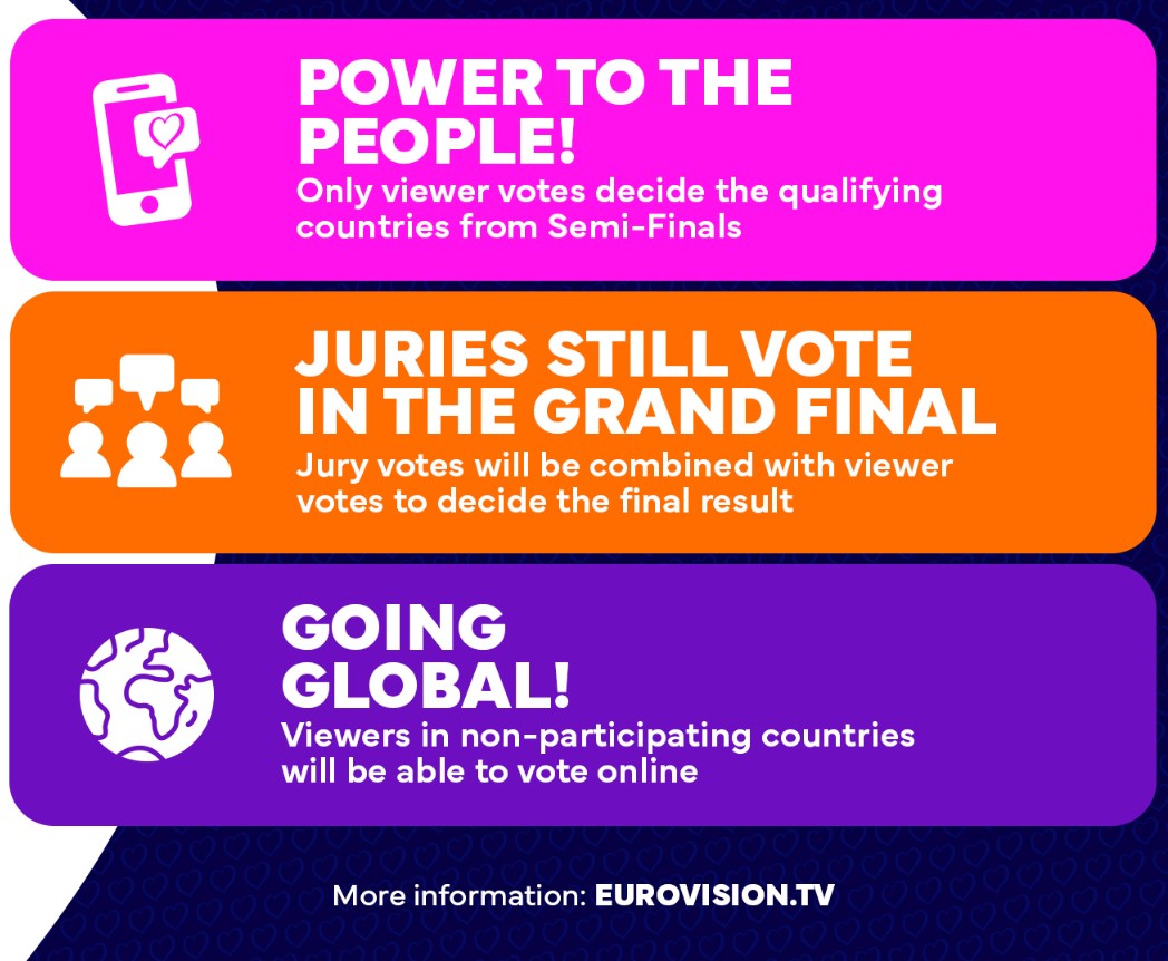 Соответствующее заявление появилось на официальной странице конкурса в Instagram. После внесенных изменений именно зрители будут решать, какие страны пройдут в финал, не считая Великобритании, Франции, Германии и Испании, поскольку это страны-основатели и они автоматически проходят в финал. Оценки жюри будут учитываться только при выборе победителя в гранд-финале.
