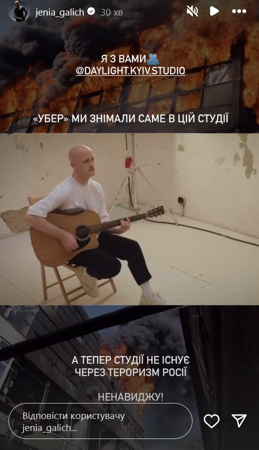 Женя Галич выложил кадр из клипа на песню "Убер", который снимали в этой студии. "Я с вами, Daylight", - поддержал музыкант.