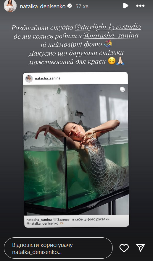 Наталка Денисенко показала фотографию со своей фотосессии в аквариуме и написала: "Разбомбили студию Daylight, где мы когда-то делали эти невероятные фото. Спасибо, что дарили столько возможностей для красоты".