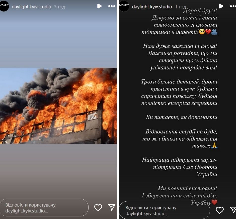 "Дроны прилетели в угол здания и вызвали пожар, здание полностью выгорело изнутри, - сообщили они в "сториз". - Вы спрашиваете, как помочь. Восстановления студии не будет, поэтому и банки на восстановление тоже. Лучшая поддержка сейчас - поддержка Сил Обороны Украины. Мы должны выстоять! И сохранить наш общий дом: Украину".