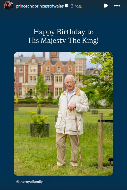 К поздравлениям присоединились Кейт Миддлтон и принц Уильям. "С днем рождения, Ваше Величество Король!", - написала королевская пара в Instagram рядом с новым изображением Чарльза.