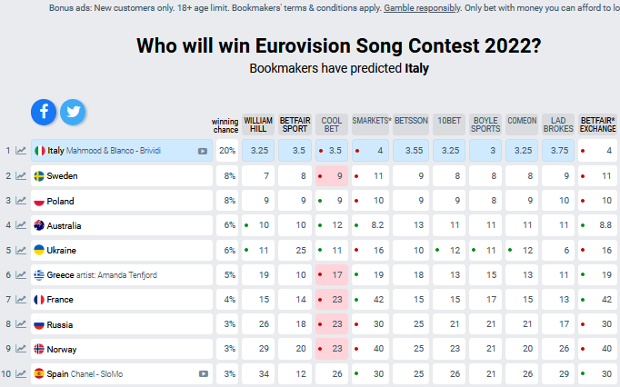 По состоянию на утро 18 февраля, наша страна, по мнению букмекеров, занимает пятое место. На четвертую строчку поставили Австралию, на третью - Польшу, второе место в обновленном списке принадлежит Швеции. Победитель остается прежним - итальянские певцы Mahmood и BLANCO, которые будут представлять страну-хозяйку нынешнего "Евровидения".