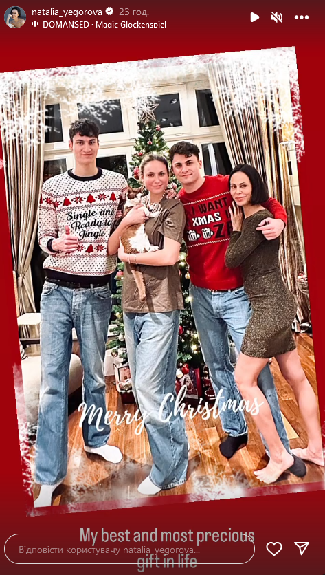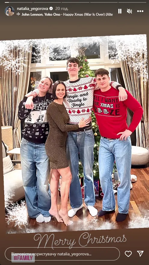 Бывшая жена Кличко в своем Instagram показала взрослых детей и с нежностью написала: "Мой лучший и самый ценный подарок в жизни". В кадре 21-летняя Елизавета-Виктория, 18-летний Максим и 23-летний Егор-Даниель в рождественских свитерах обнимаются с мамой на фоне праздничной елки.