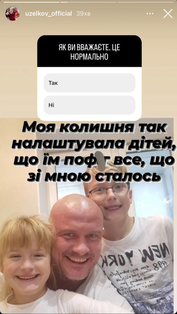 В этом спортсмен обвиняет свою экс-супругу. "Моя бывшая так настроила детей, что им пофиг на все, что со мной произошло", - пожаловался Узелков в Instagram-историях и добавил "голосовалку" с вопросом: "Как вы думаете, это нормально?" и возможностью ответить "да" или "нет".