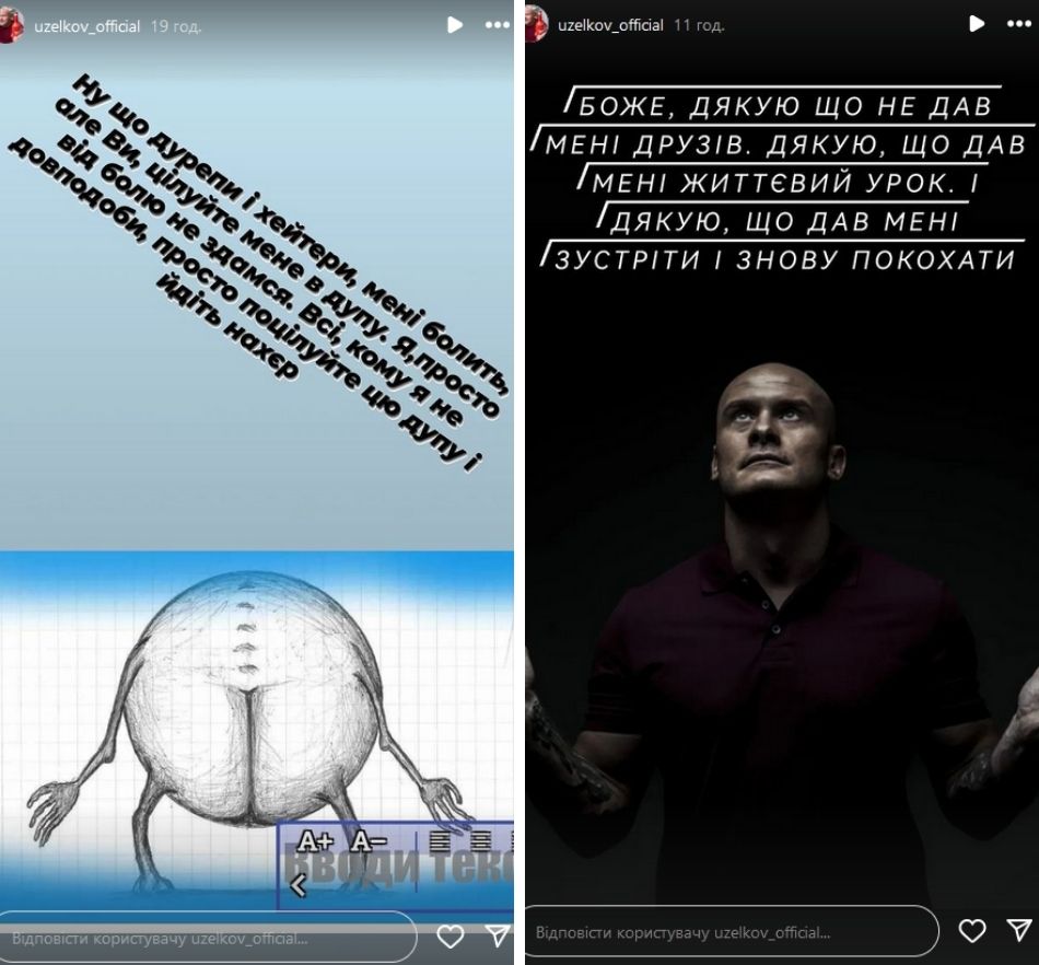 "Боже, спасибо, что не дал мне друзей, спасибо, что дал мне жизненный урок. И спасибо, что дал мне встретить и снова полюбить", - добавил Узелков, который в декабре 2023 года сообщил, что собрался жениться.