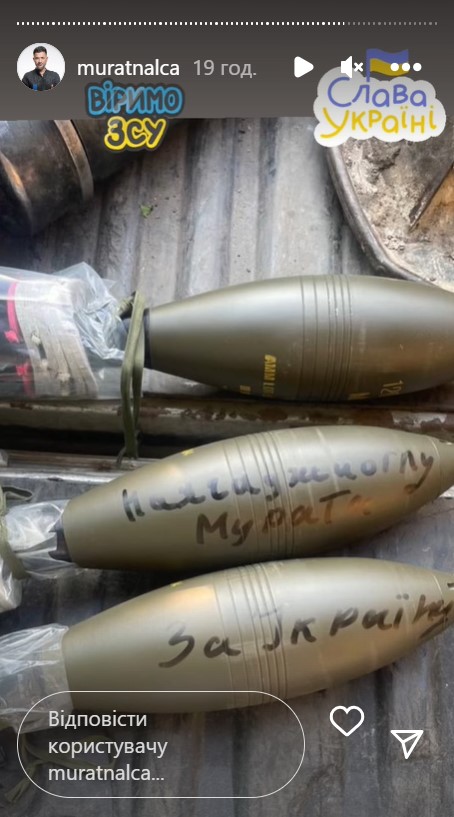 Однако не только словами мужчина поддерживает Украину. Так, в stories он показал, что недавно передал "поздравления" русским захватчикам. В соцсетях Мурат выложил снимок, на котором можно увидеть боеприпасы, где написано: "Мурат Налчаджиоглу, за Украину". Этим поступком бизнесмен приобщился к инициативе Укроборонпрома – в ее рамках артисты, военные и общественные деятели оставляют на новеньких боеприпасах послания для агрессоров.