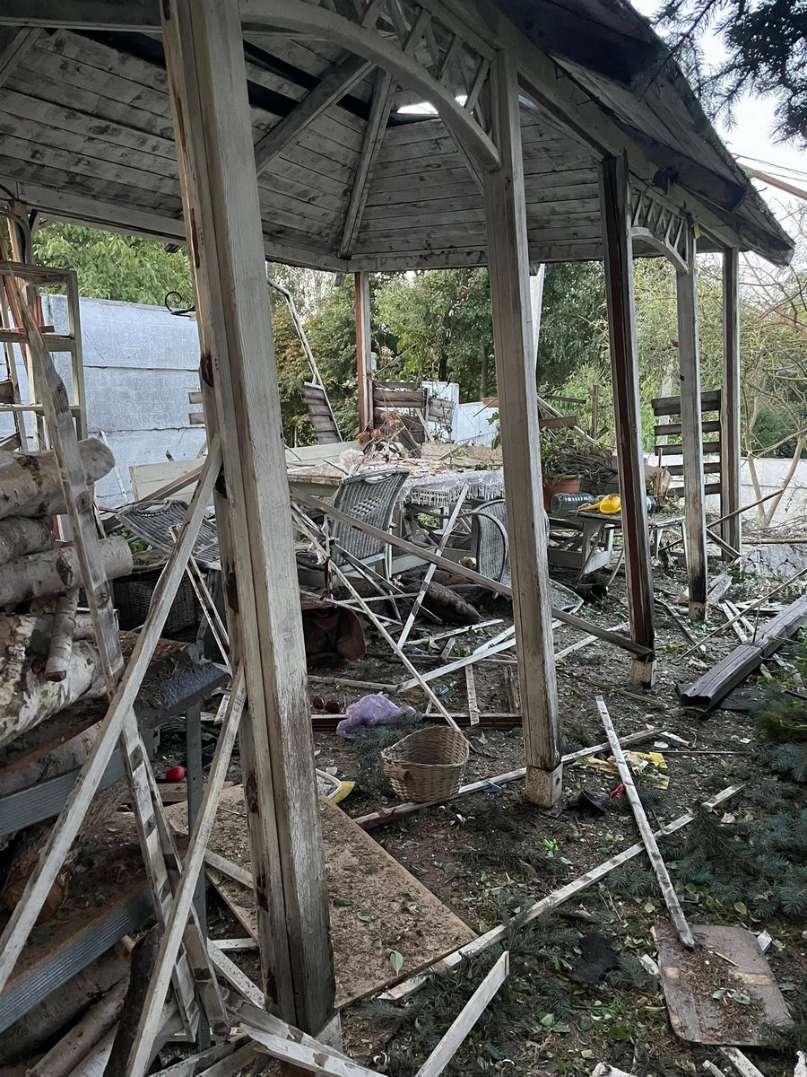 "У нас взорвался "шахед" прямо во дворе. На подлете мы успели спуститься в подвал с мамой и дочерью. Вокруг обломки "шахеда", еще и с номером, сволочи. Он горел, а я тушила. Деревья снесены полностью. В доме вынесено все: окна, двери. Все в стекле. Когда-то был забор, а сейчас его нет. Машина - только на металлолом. Крышу снесло", - поделилась она.