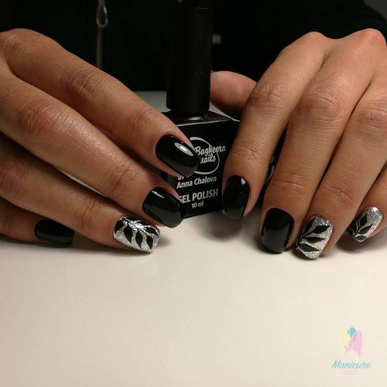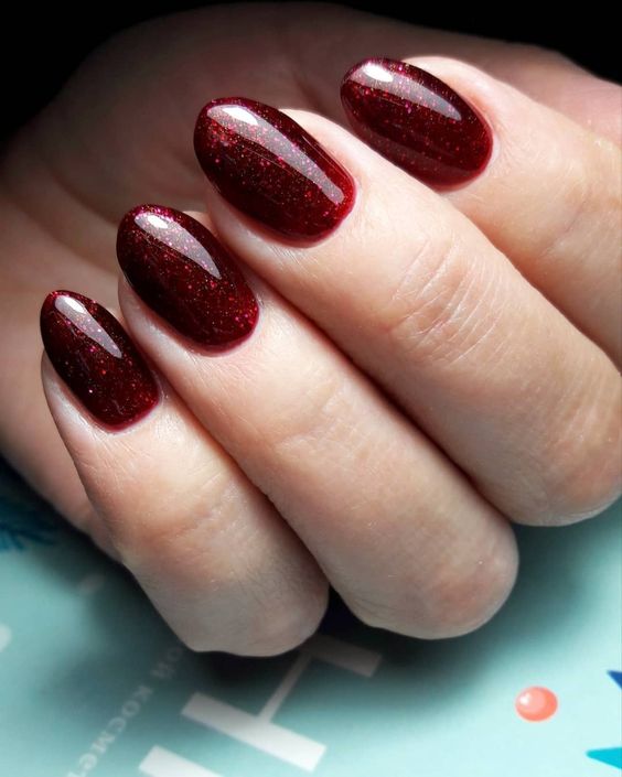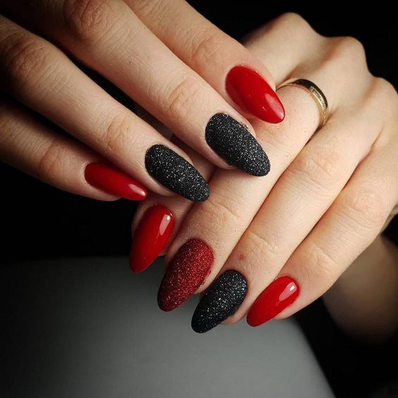 Маникюр с блестками традиционно выбирают перед новогодними и рождественскими праздниками. Однако если вы соскучились по атмосфере волшебства, можно покрыть ногти черно-красного цвета блестящим покрытием уже сейчас.