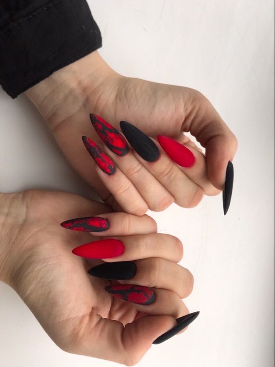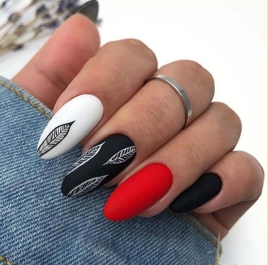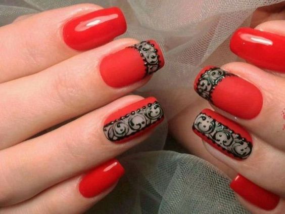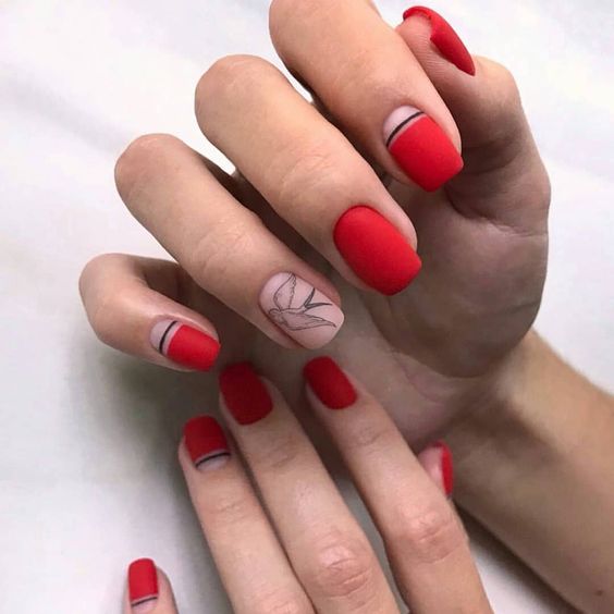 Маникюр с матовым покрытием всегда будет выглядеть изысканно, а если сочетать, например, красный с элементами черного цвета – вы точно будете самой стильной.