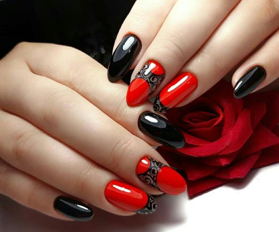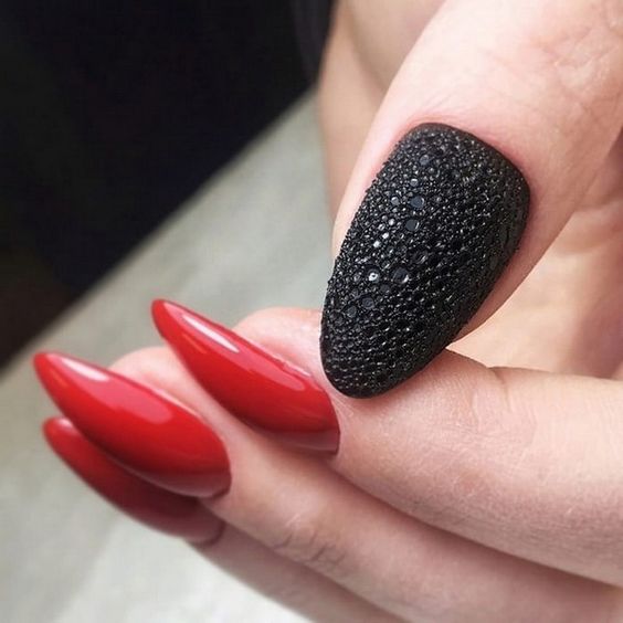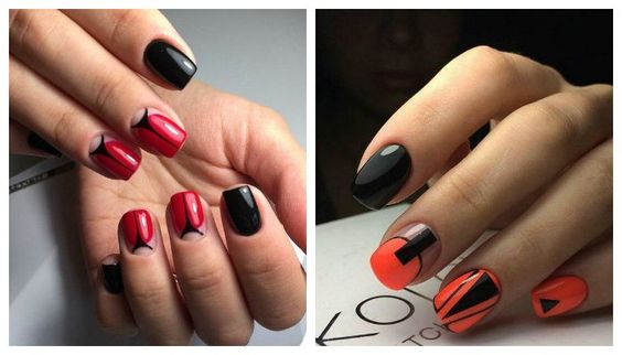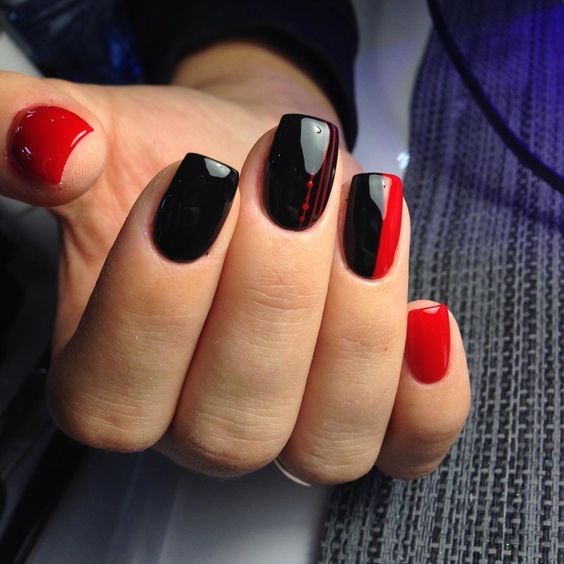 Неизменная классика всегда в моде, поэтому если вы не любите заморачиваться с дизайном, можно просто выбрать однотонный маникюр. Некоторые модницы пошли дальше, и просят своих мастеров нейл-арта покрыть одну руку красным, а вторую – черным. Или же можно сочетать эти два цвета в маникюре.