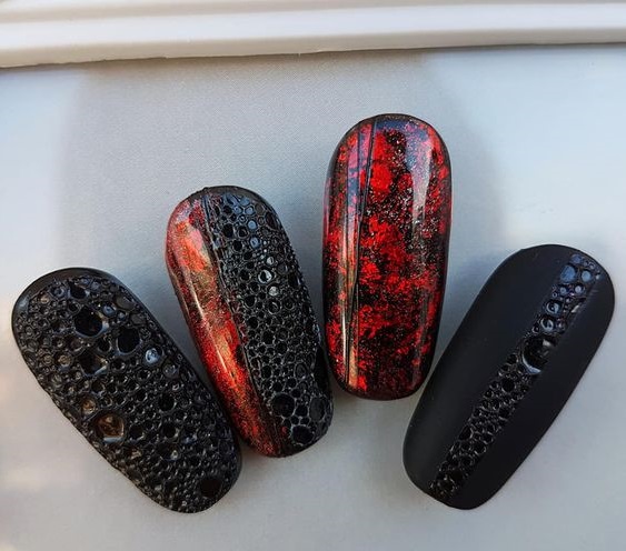 Красное и черное покрытие – идеальные варианты для самого трендового дизайна Bubbles nails, что в переводе с английского – "пенные ногти". Для создания этого эффекта вам понадобится мыльная пена.