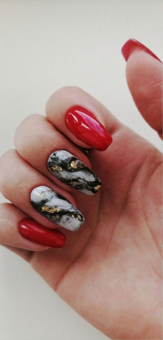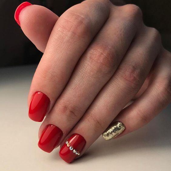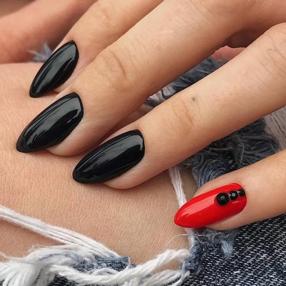 Еще одним вариантом дизайна в черно-красном цвете будут золотистые или серебристые детали на ногтях.