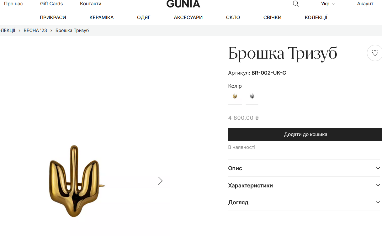 Серебряное с позолотой украшение изготовлено мастерами бренда вручную. Цена брошки как у Елены Зеленской - 4800 грн. На сайте Gunia Project это ювелирное изделие представлено также в серебряном варианте без покрытия позолотой.