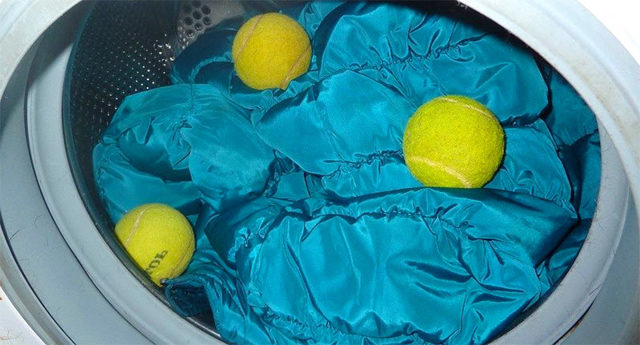 1. Дождаться, пока вещь высохнет, а затем отправить ее в стиральную машинку, включить отжим не менее 800 оборотов, а также положить внутрь 2-3 теннисных мяча – это необходимо для того, чтобы разбить комки пуха во время стирки.