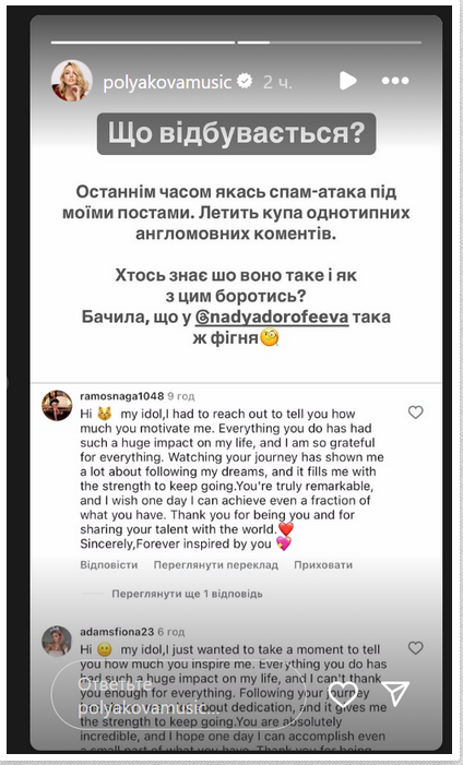 Так, артистка Оля Полякова отметила, что наблюдает странную активность на своей странице. Речь идет о массовых сообщениях от англоязычных пользователей под публикациями.