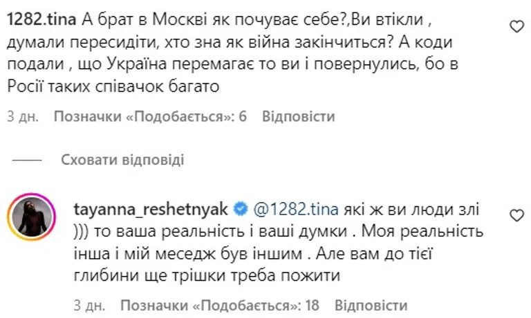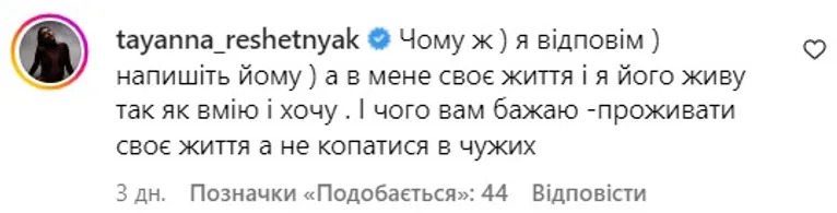 "Почему же. Я отвечу, напишите ему. А у меня своя жизнь и я его живу так, как умею и хочу. И чего вам желаю – проживать свою жизнь, а не копаться в чужих. Какие же вы люди злые. То ваша реальность и ваши мысли. Моя реальность другая и мой месседж был другим. Но вам до той глубины еще немного нужно пожить", - отвечала артистка в комментариях у себя на странице в Instagram.