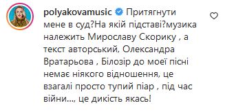 "Привлечь меня в суд? На каком основании? Музыка принадлежит Мирославу Скорику, а текст авторский, Александра Вратарева. Билозир к моей песне не имеет никакого отношения, это вообще тупой пиар во время войны. Это какая-то дикость!", - написала Полякова.